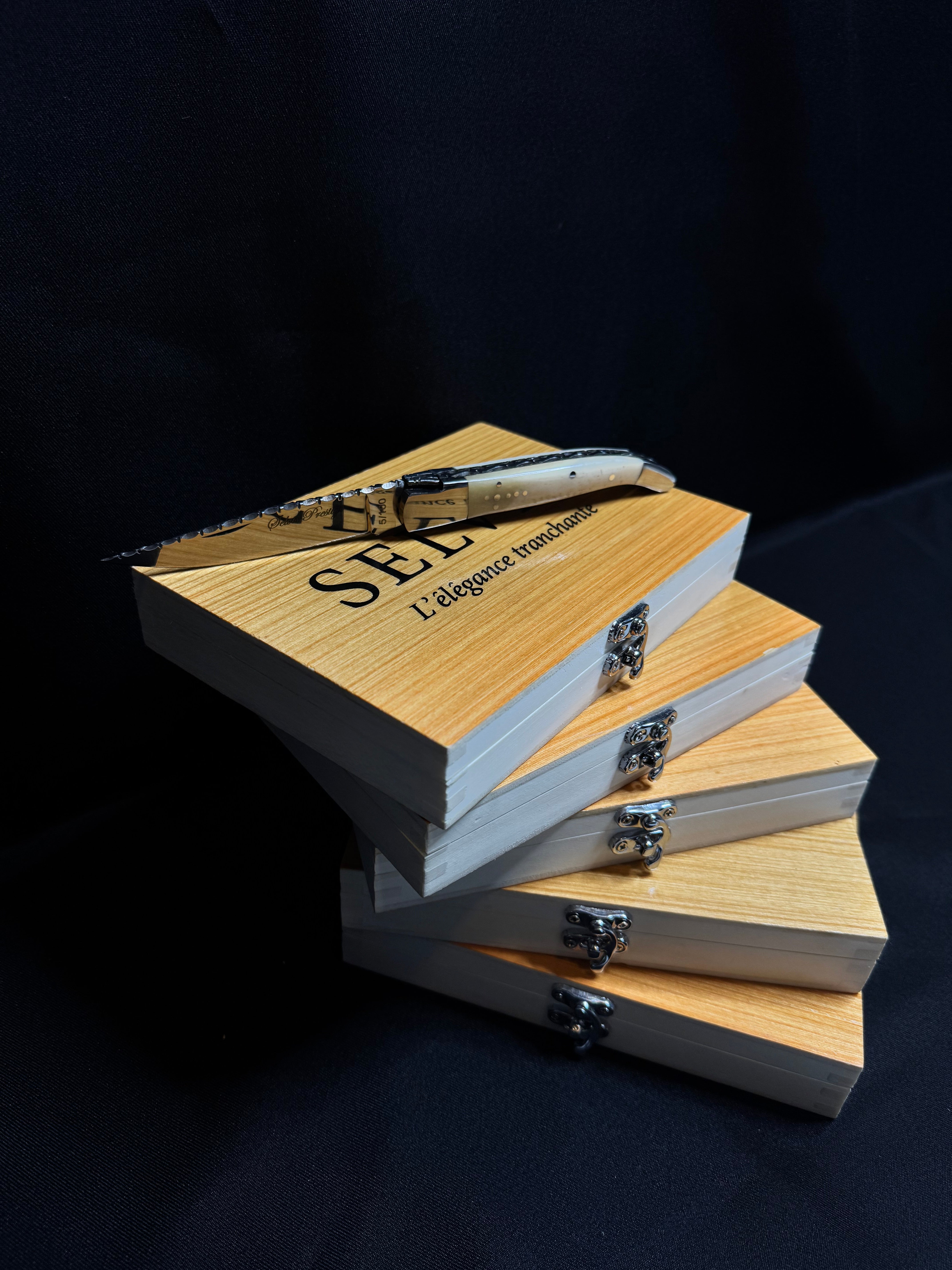 Retrouvez en édition limitée, la première édition de Maison Selvis. Le couteau Prestige avec son manche en os de chameau et sa lame en acier guilloché.